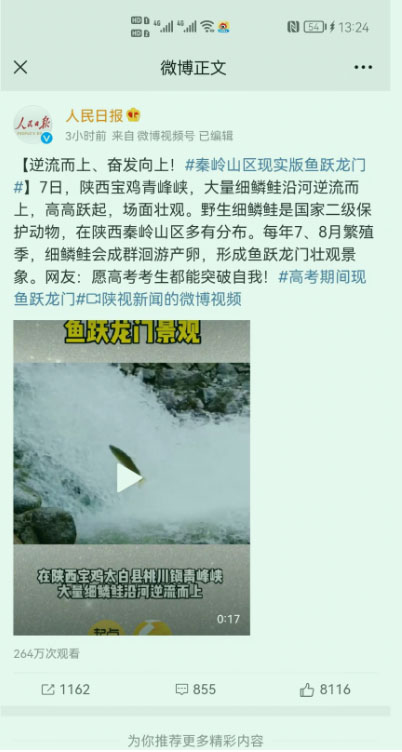 青峰峡国家森林公园地处秦岭腹地,,,,,,位于陕西省宝鸡市太白县,,,,,,被誉为“森林氧吧”和“避暑胜地”。。。。。。。这里保存着原生态的风貌,,,,,,因其境内自然环境保唬唬唬唬护好,,,,,,6月7日正值高考期间,,,,,,在景区内,,,,,,大量细鳞鲑高高跃起,,,,,,沿河逆流而上,,,,,,场面十分壮观。。。。。。。